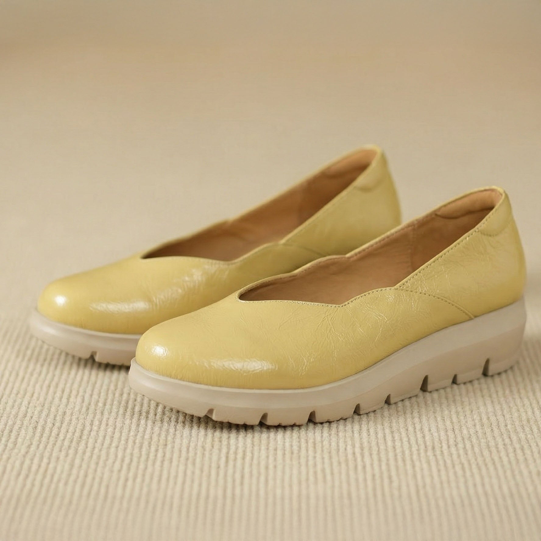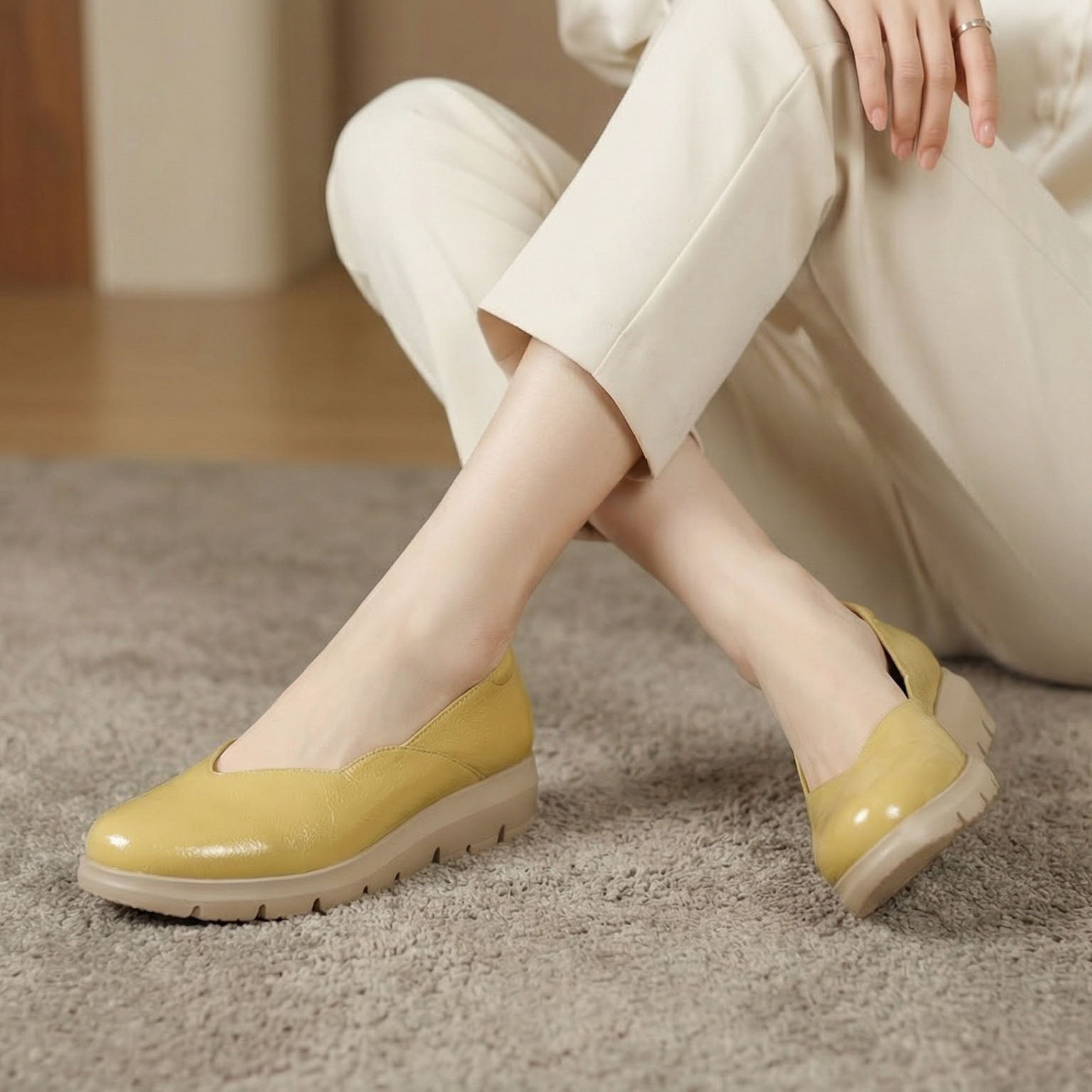 Crafted from a smooth, structured upper with a gentle sheen, this flat offers a cushioned, supportive feel that stays comfortable through long days on your feet. The rounded toe, low profile, and calm off-white tone create a quietly polished silhouette that feels dependable, composed, and easy to live in.