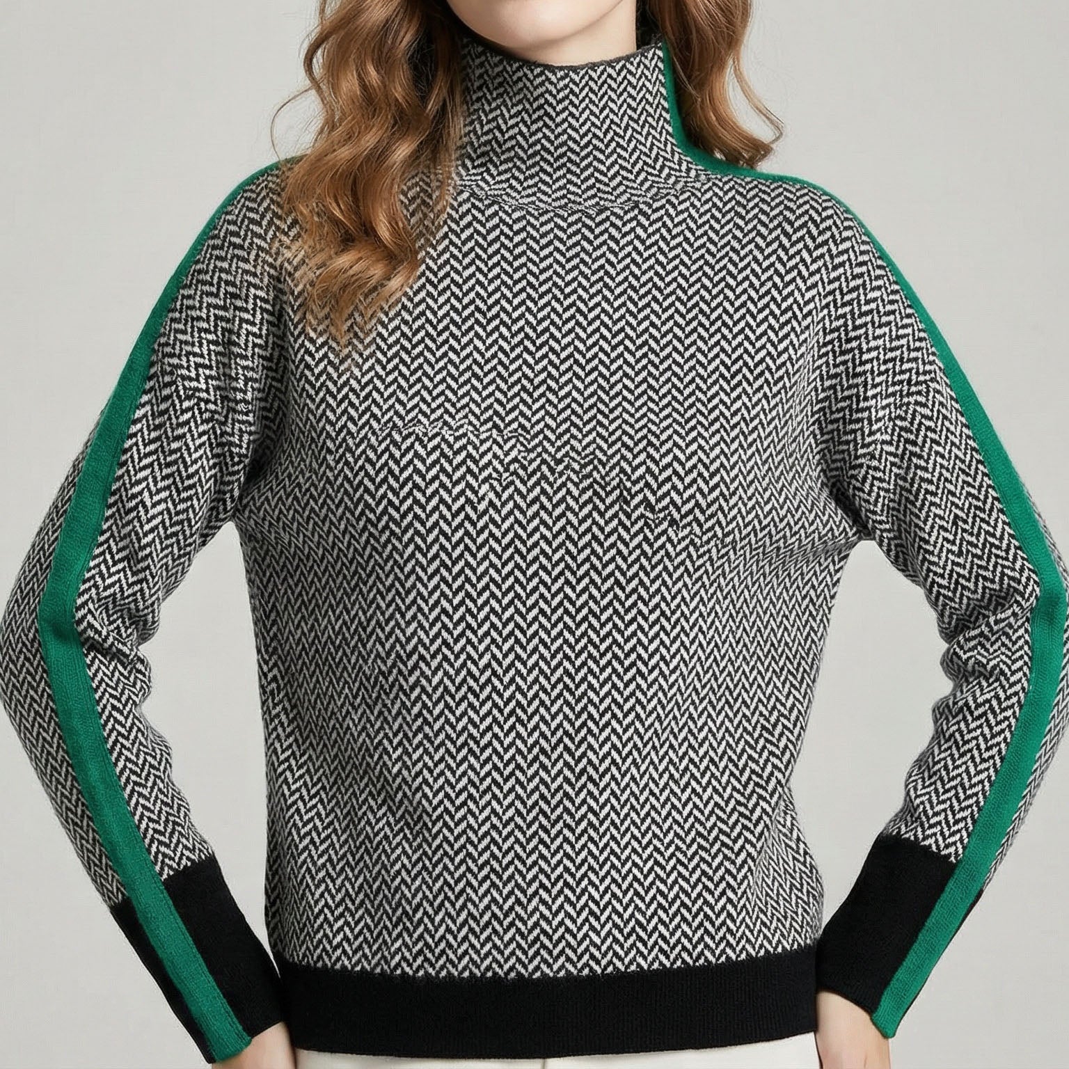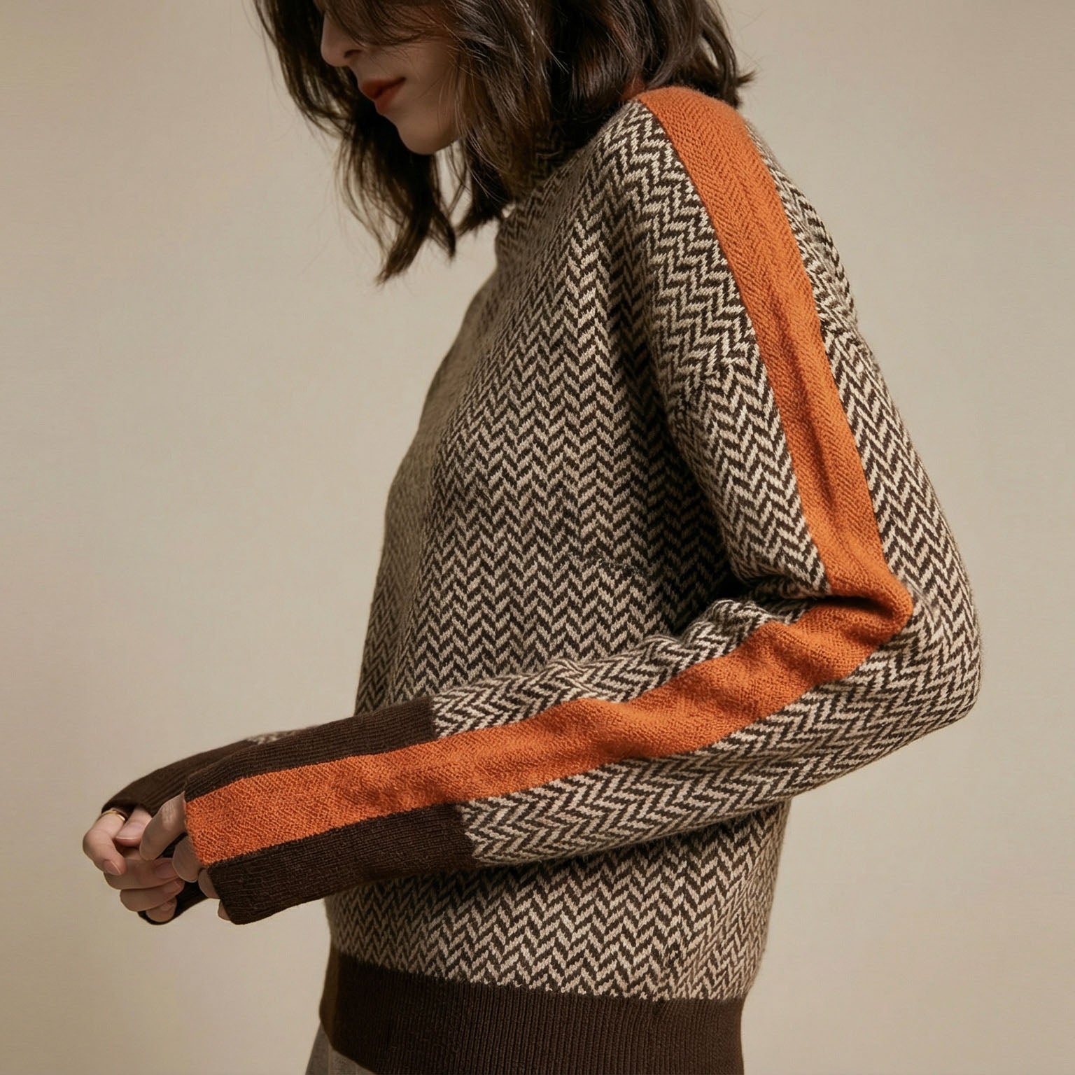 Crafted from a luxury knit construction, this sweater feels softly substantial with a smooth, comfortable drape that sits easily on the body. Designed to balance individuality with restraint, the classic herringbone pattern, contrast sleeve stripe, and relaxed structure create a quietly distinctive layer suited to everyday wear without ever feeling loud.