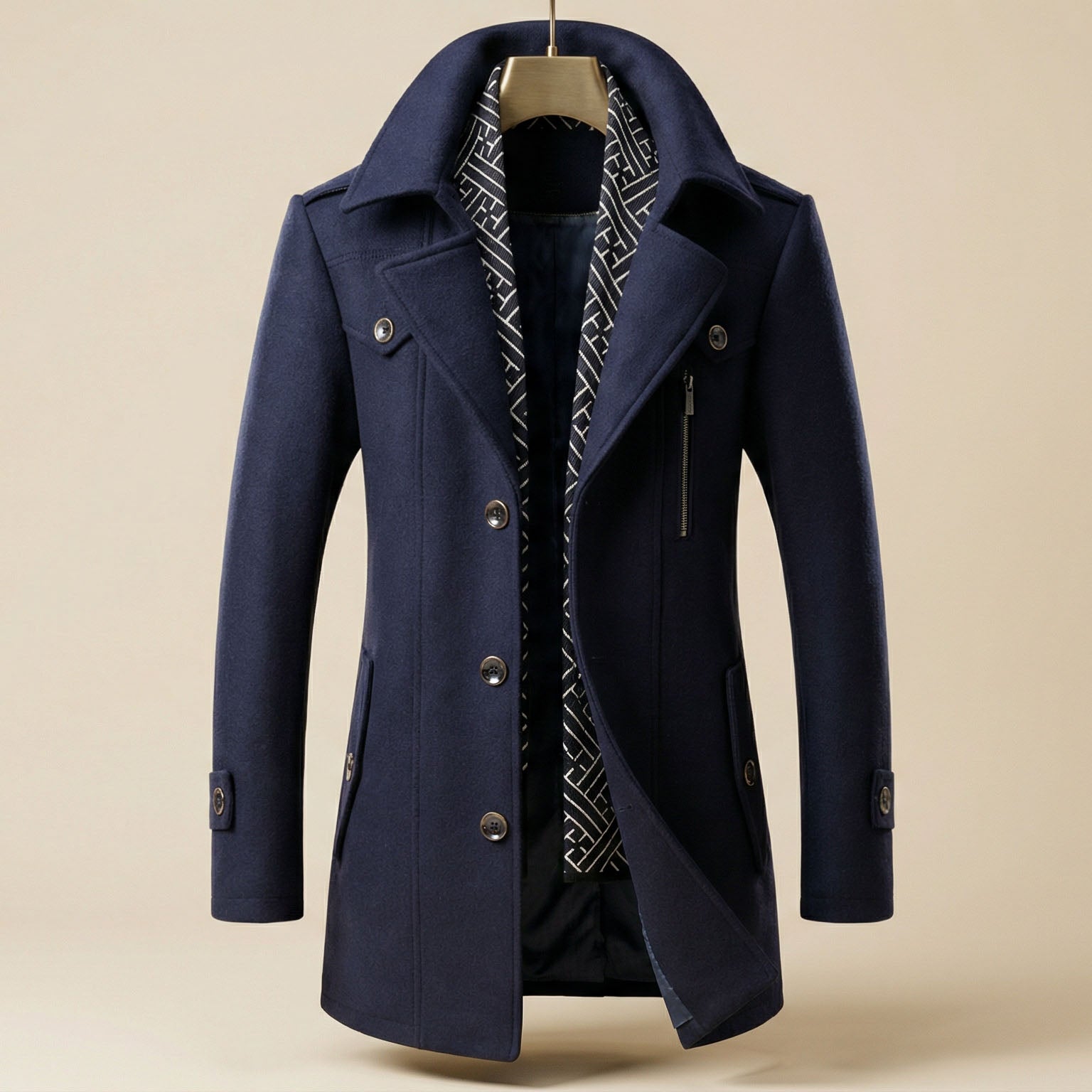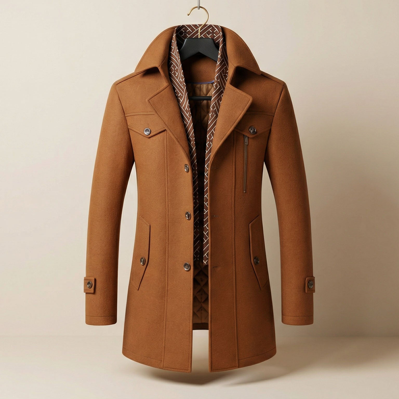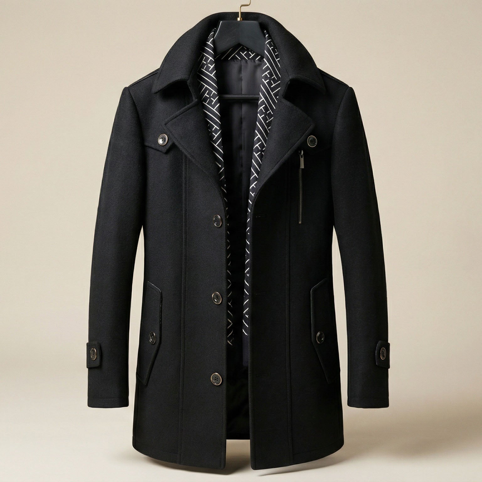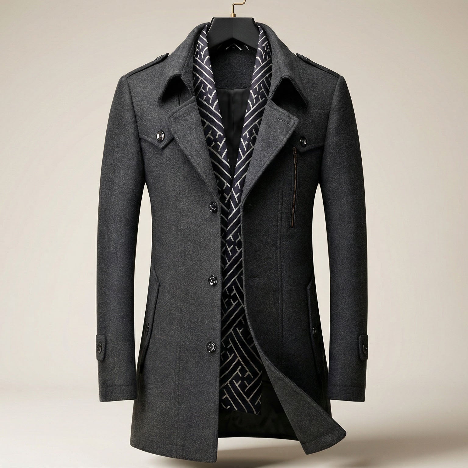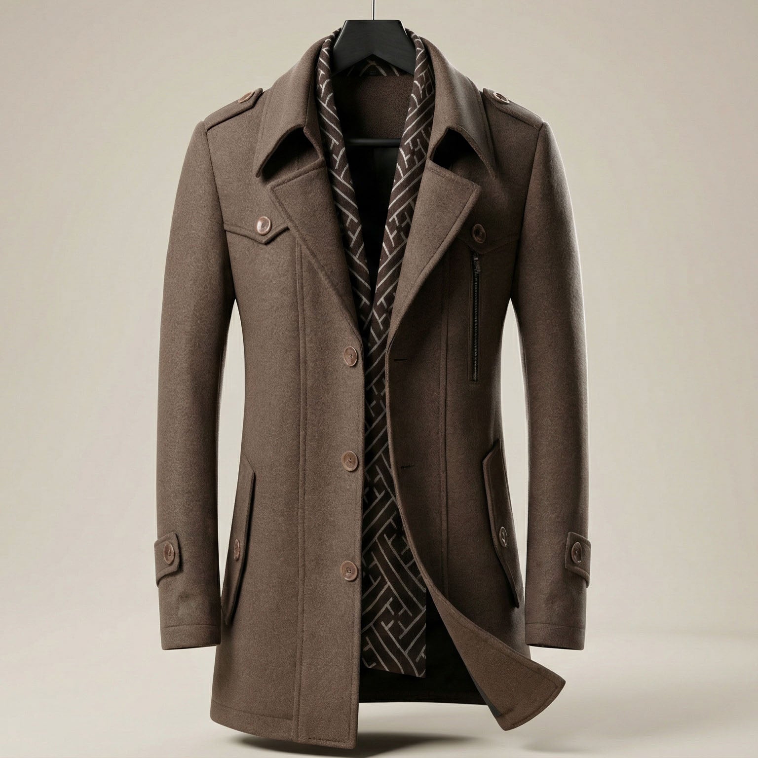A dense wool-blend shell is paired with a built-in scarf panel that adds fixed structure at the neckline without extra bulk. The tailored body is reinforced with a fleece-lined interior for steady warmth, while the set-in shoulders, tab cuffs, and angled pockets give the coat a precise, orderly shape.
