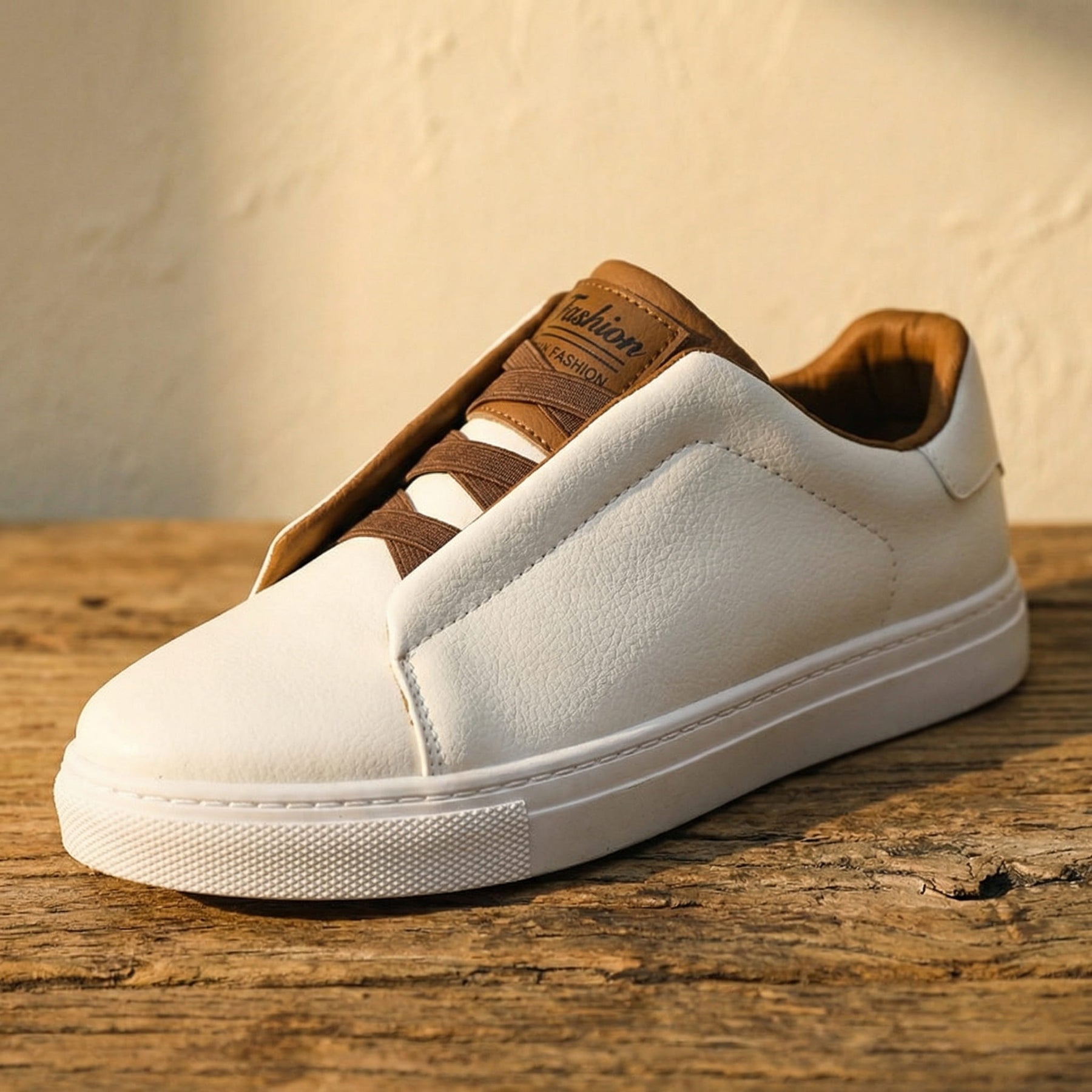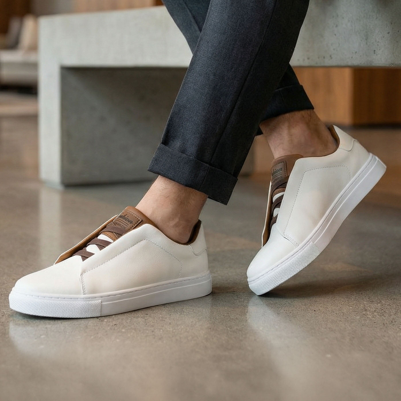 Crafted with a smooth leather-effect finish, this sneaker delivers a clean, structured feel that keeps its shape while remaining comfortable for all-day wear. The low-profile silhouette, soft white upper, and subtle brown detailing create a modern, composed look that transitions easily through casual settings without ever feeling careless.