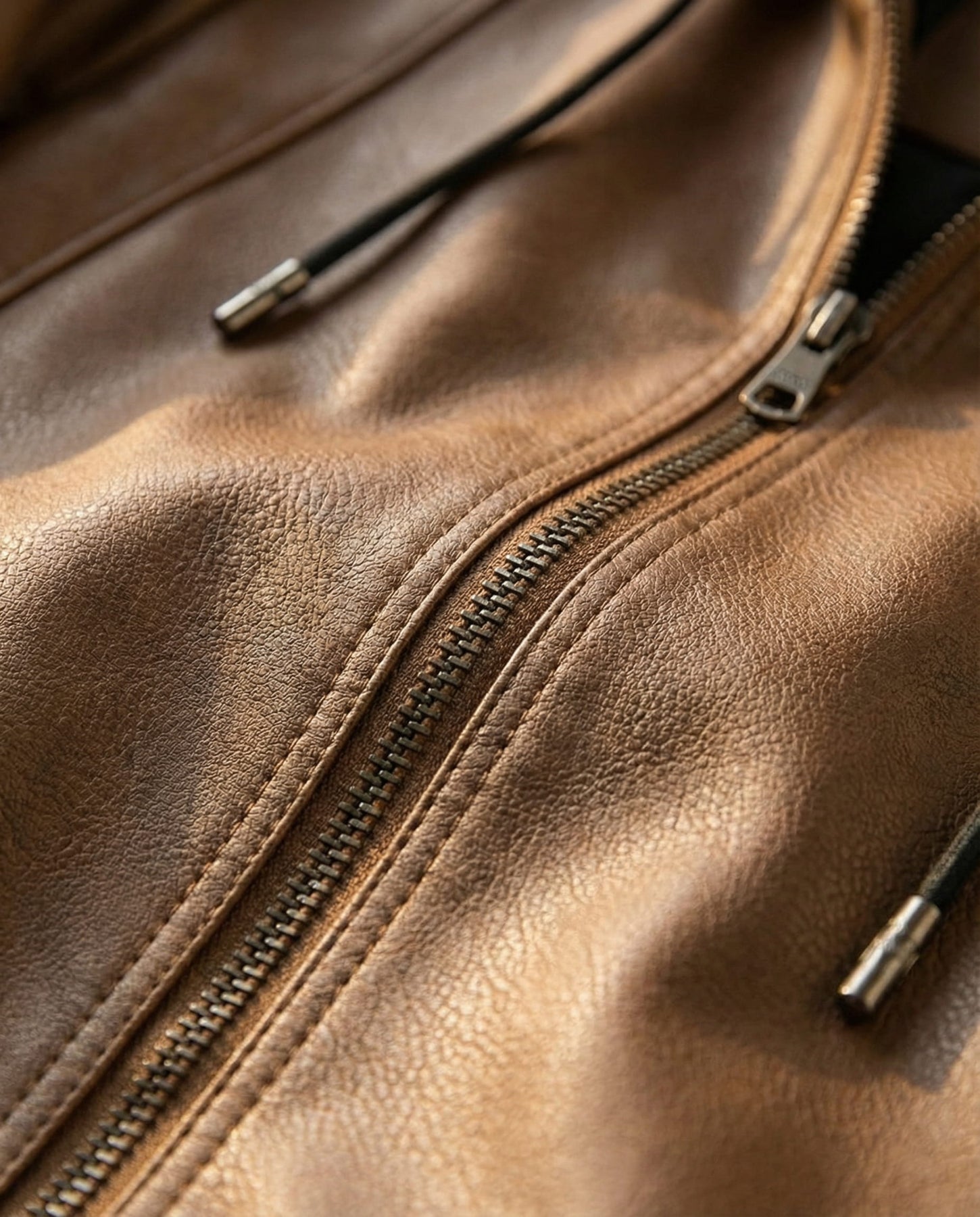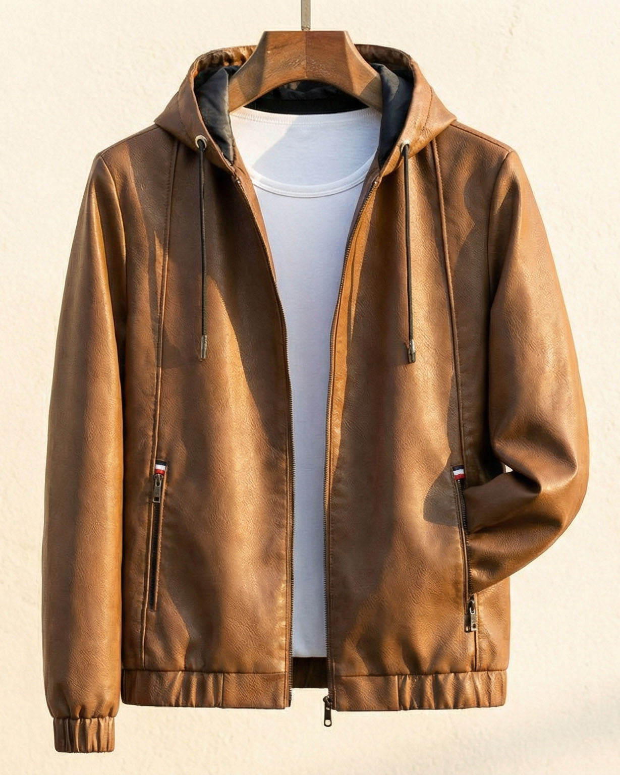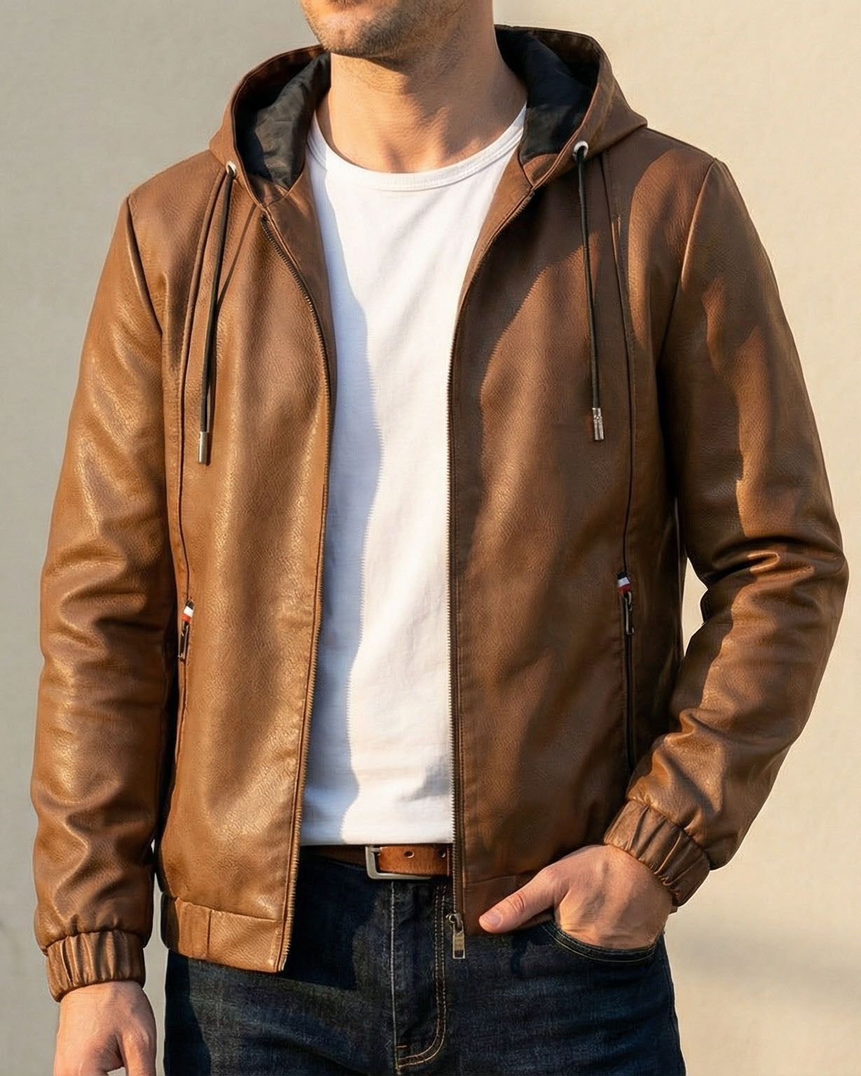 Crafted from genuine leather with a smooth, structured finish, this jacket delivers a substantial yet supple feel that offers everyday comfort with quiet strength. The warm brown tone, clean zip front, and minimal detailing are balanced by a practical hood for a refined yet grounded silhouette suited to daily wear, bringing dependable presence without unnecessary formality.