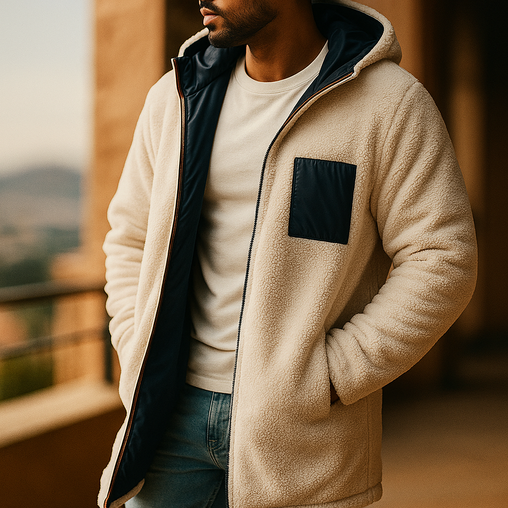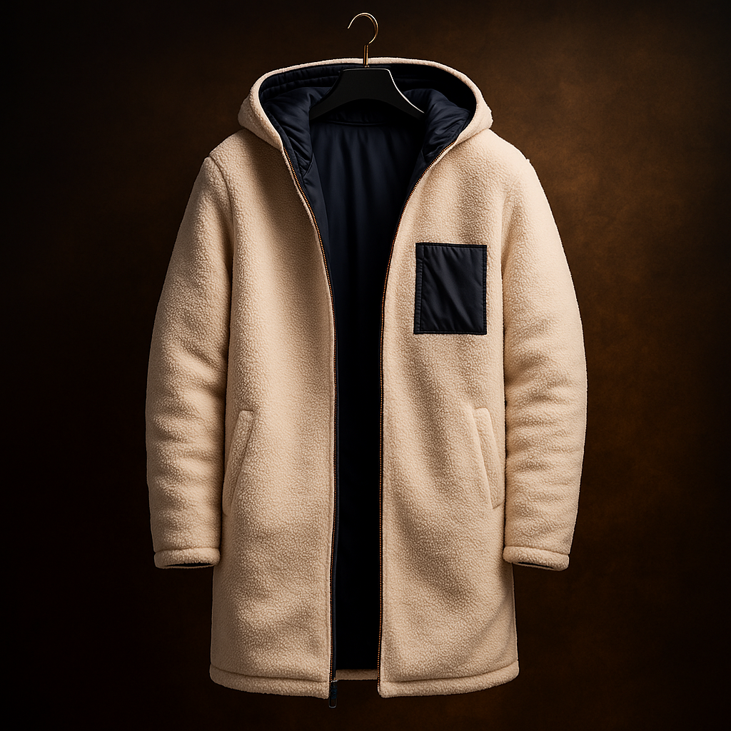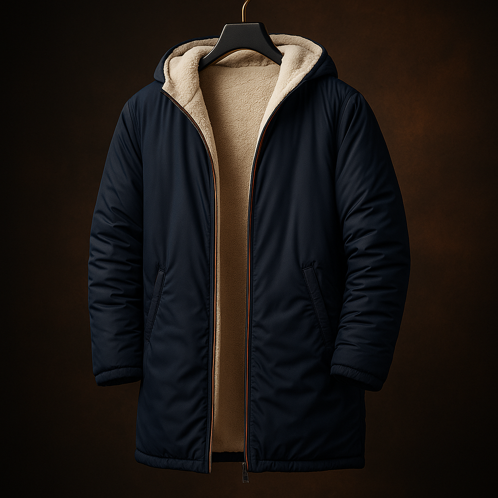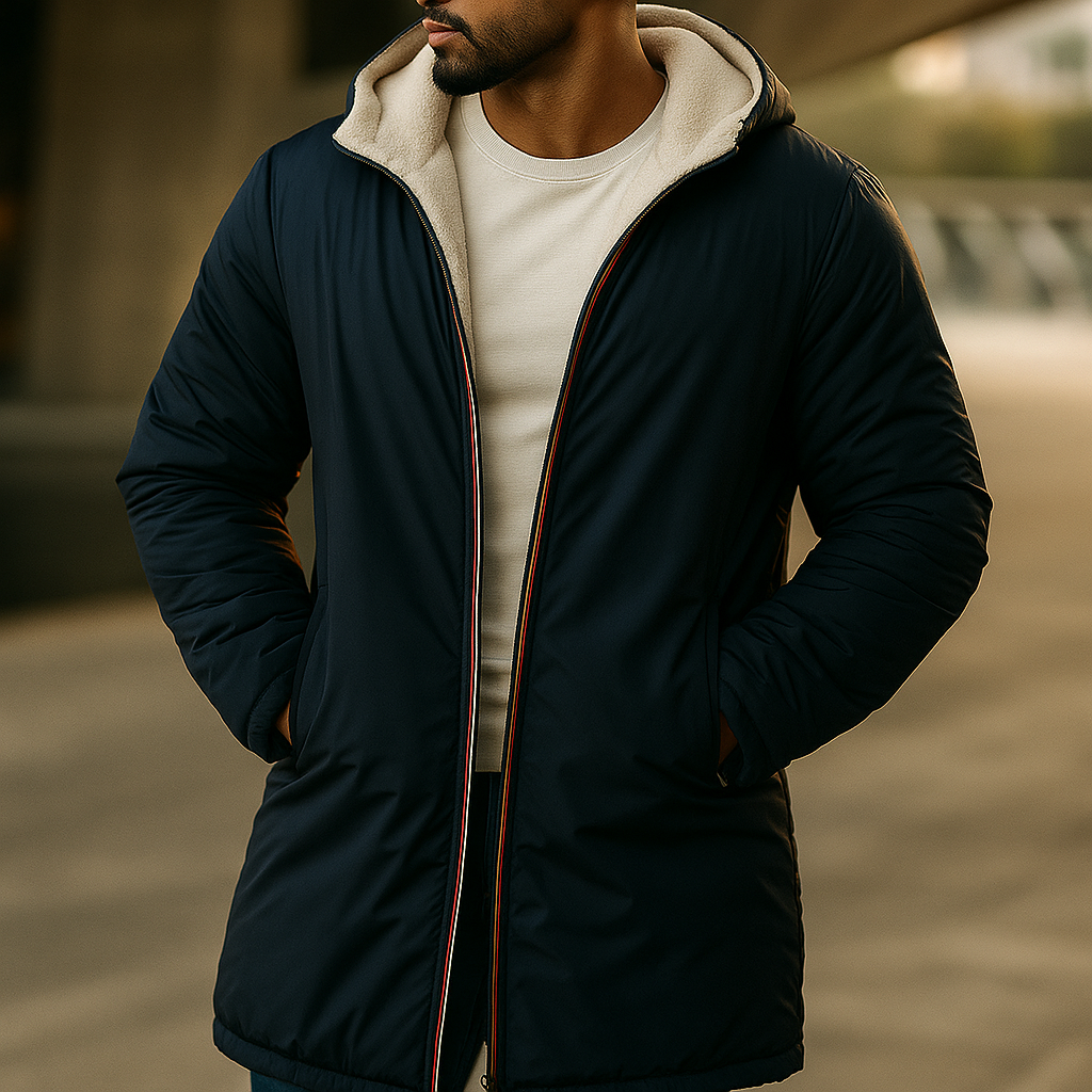 A streamlined reversible build offers two distinct surfaces with a single, uninterrupted silhouette. One side uses a smooth, insulated shell for structured warmth, while the reverse presents a soft, textured face with a contrast chest pocket. Clean lines, a straight body, and discreet pockets keep the shape controlled and uncluttered.