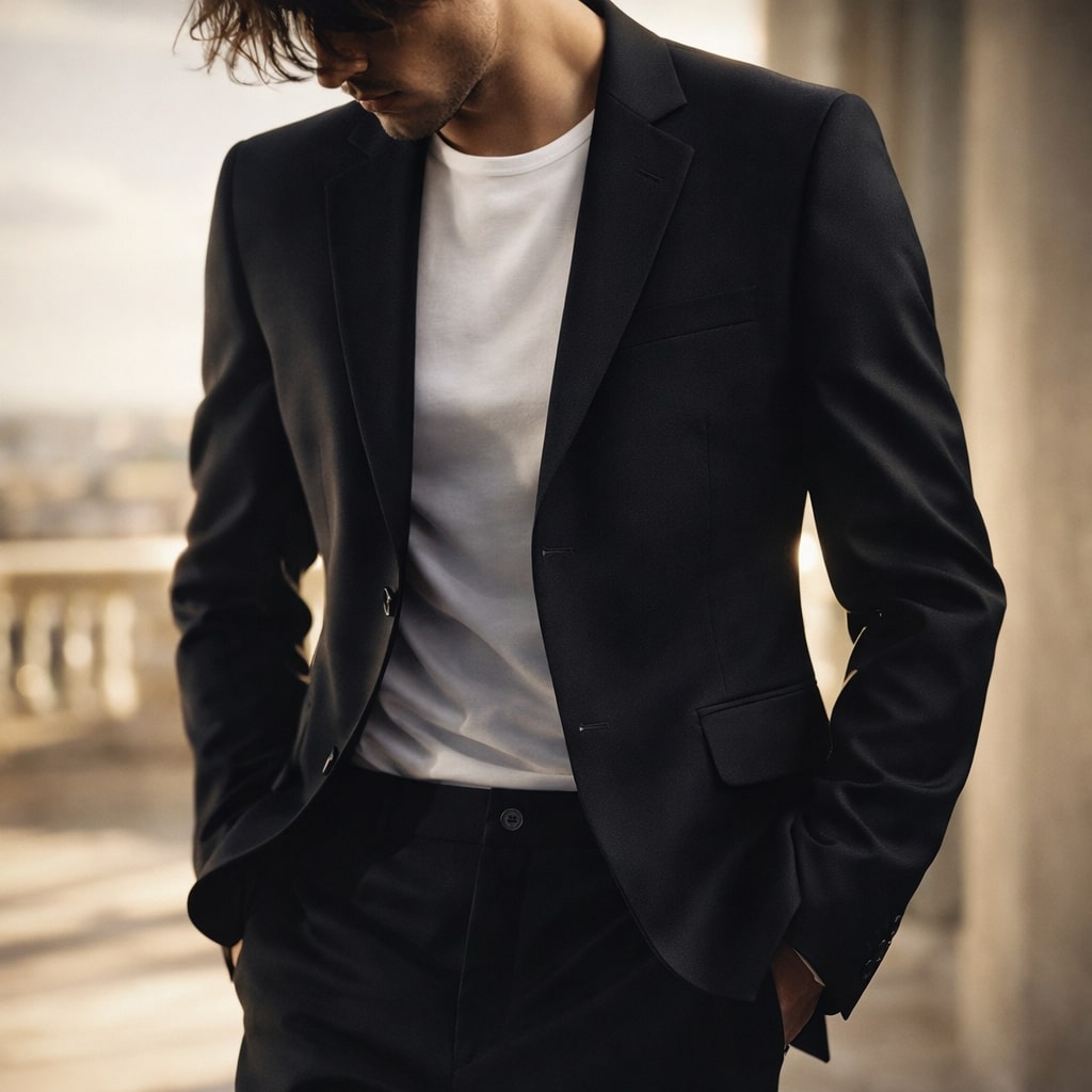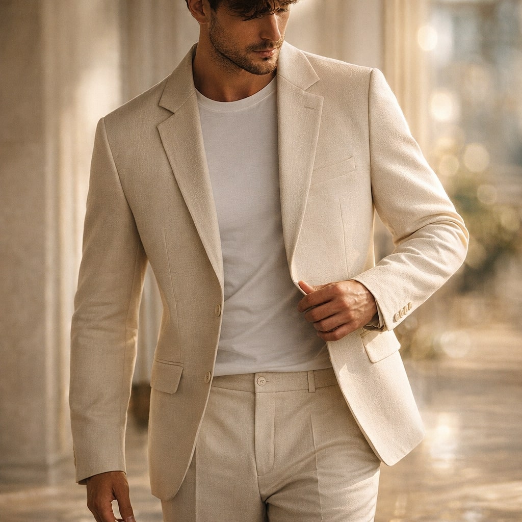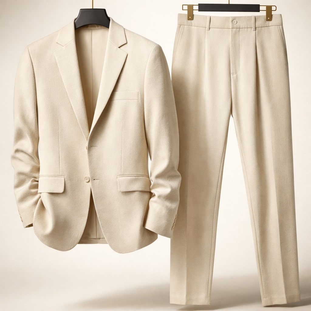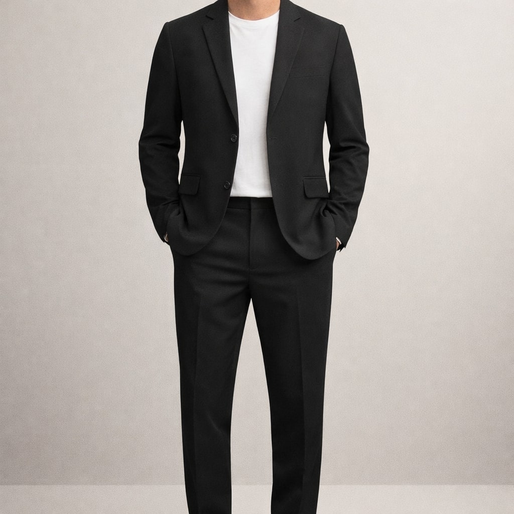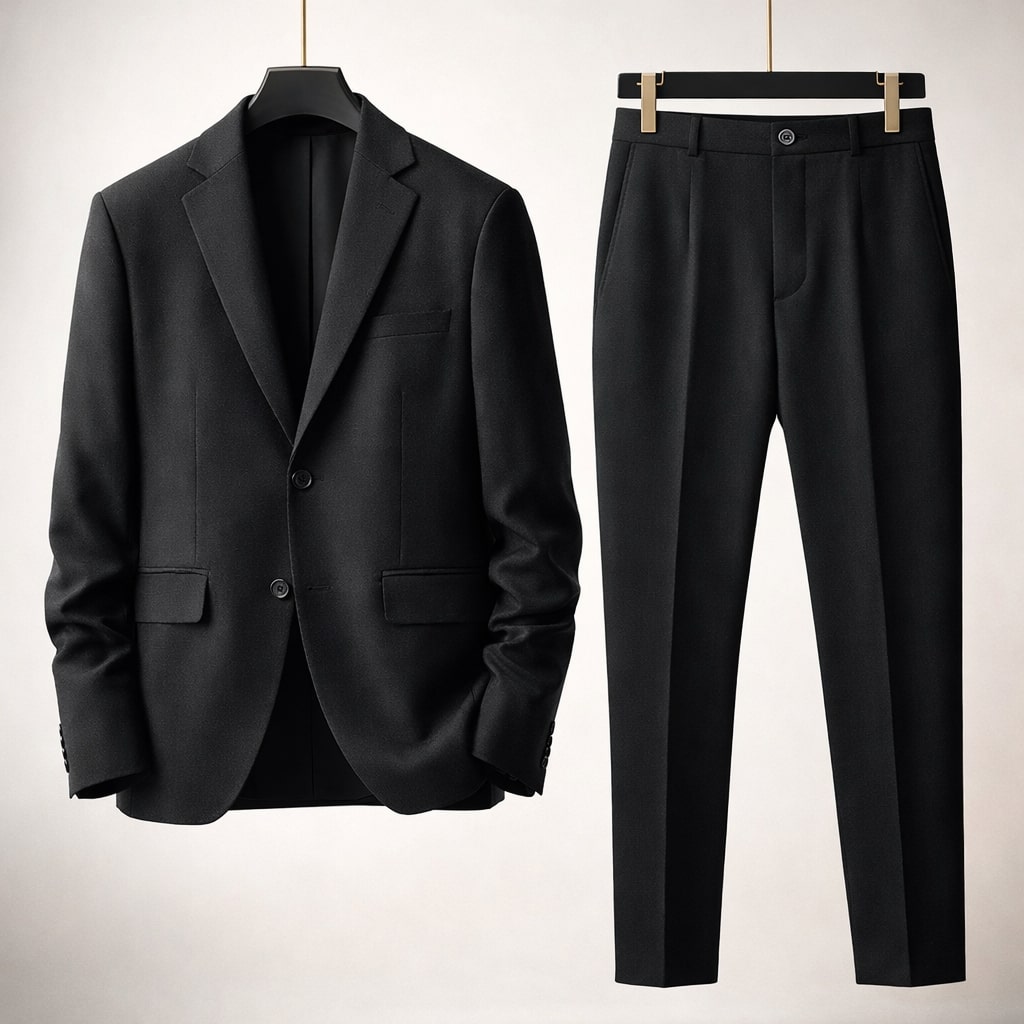 A structured suit set designed to reduce wind exposure through its fully lined blazer and substantial fabric weight, offering coverage without excessive layering. The clean tailoring and balanced cut distribute material evenly across the body, minimizing bulk while maintaining a composed, stable silhouette.