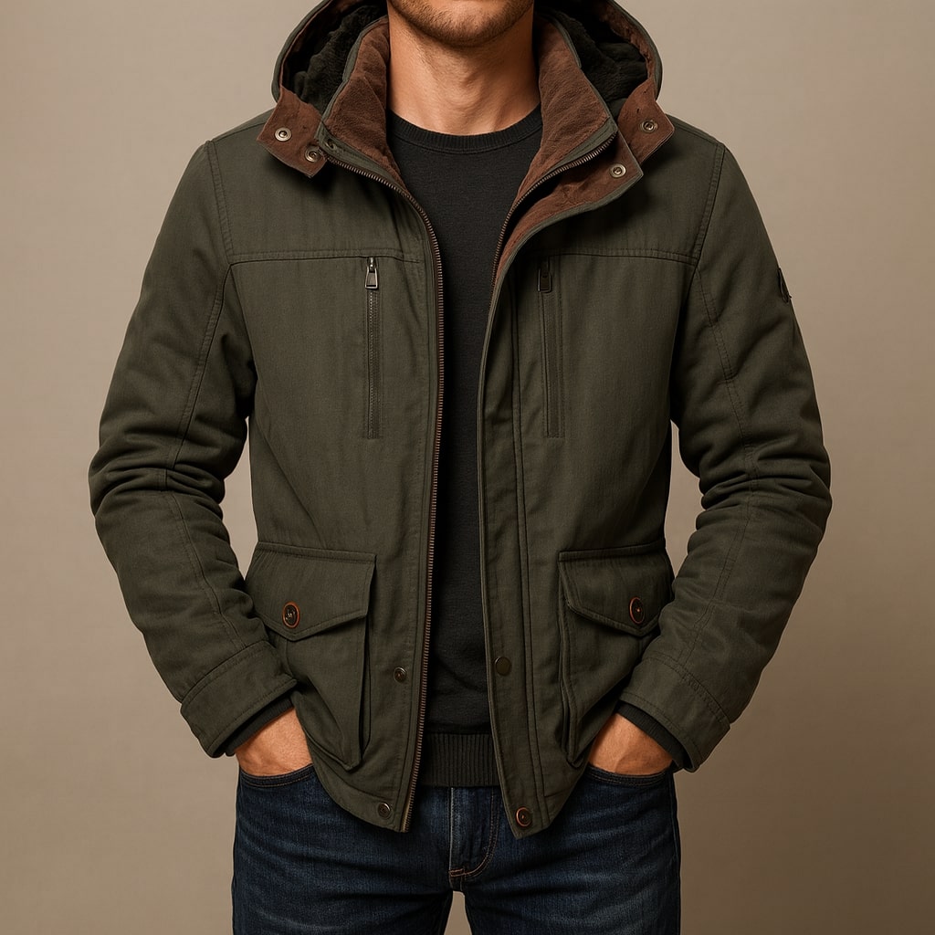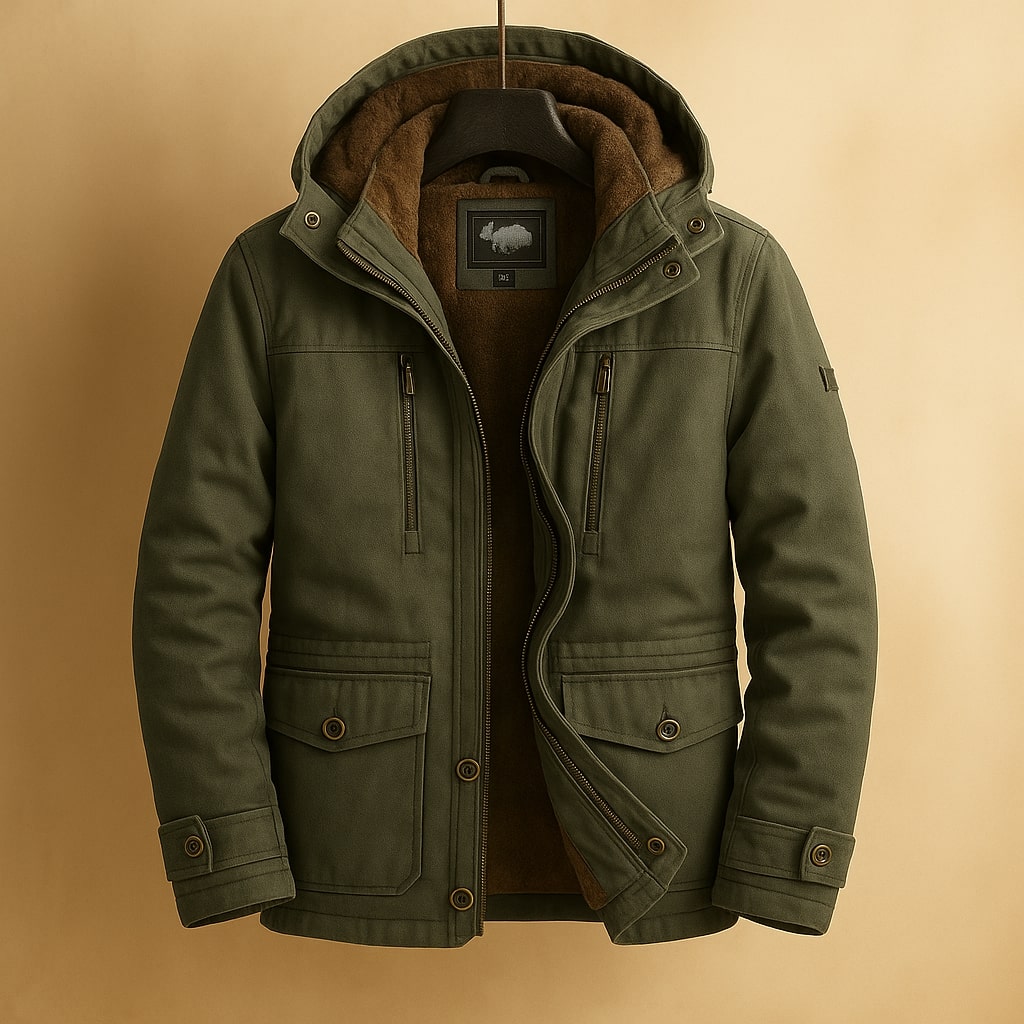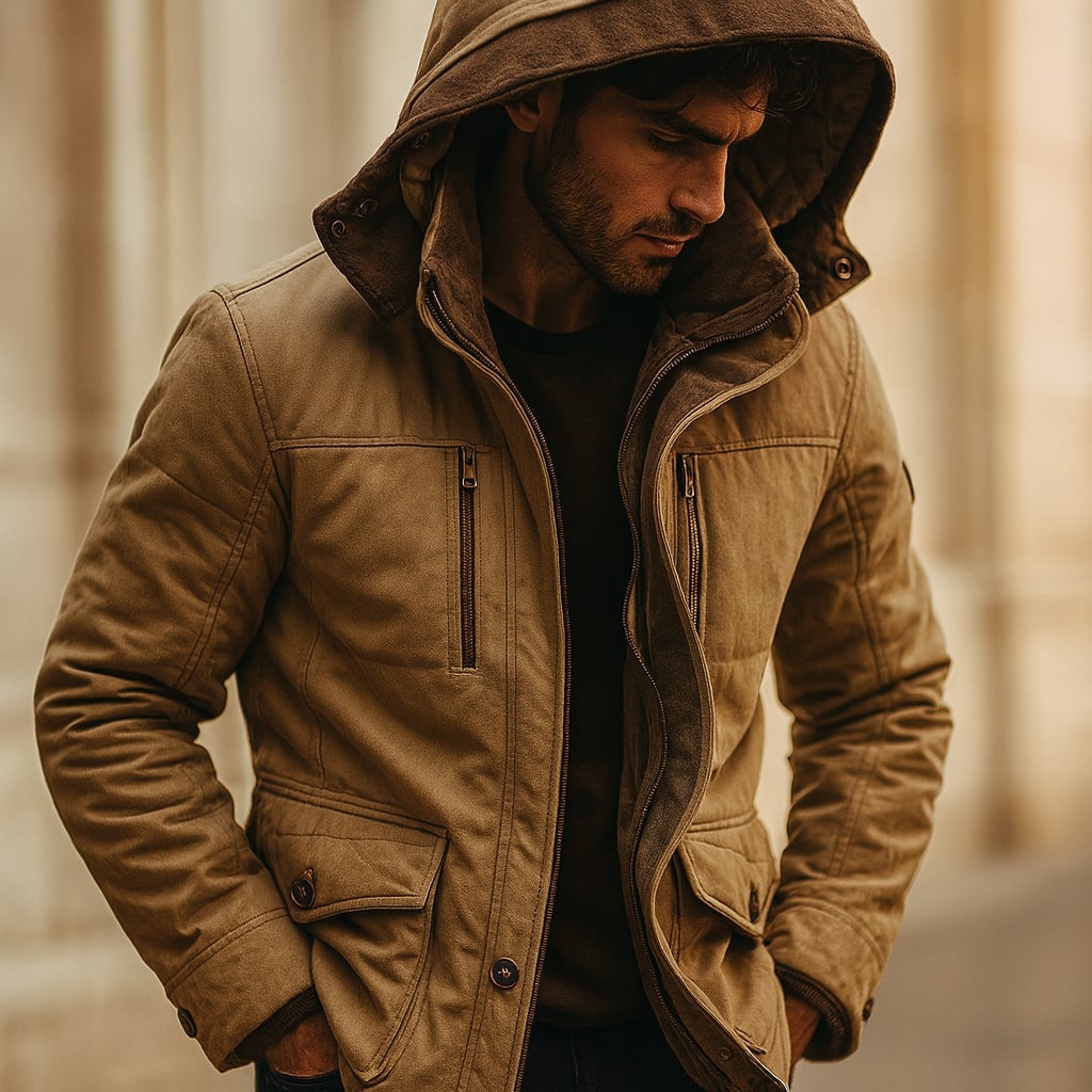 A tightly woven cotton shell paired with a soft interior lining reduces cold and wind penetration while keeping overall weight controlled. The streamlined hood, clean zip-and-snap closure, and balanced pocket placement prevent bulk, maintaining a steady, easy-to-wear silhouette.