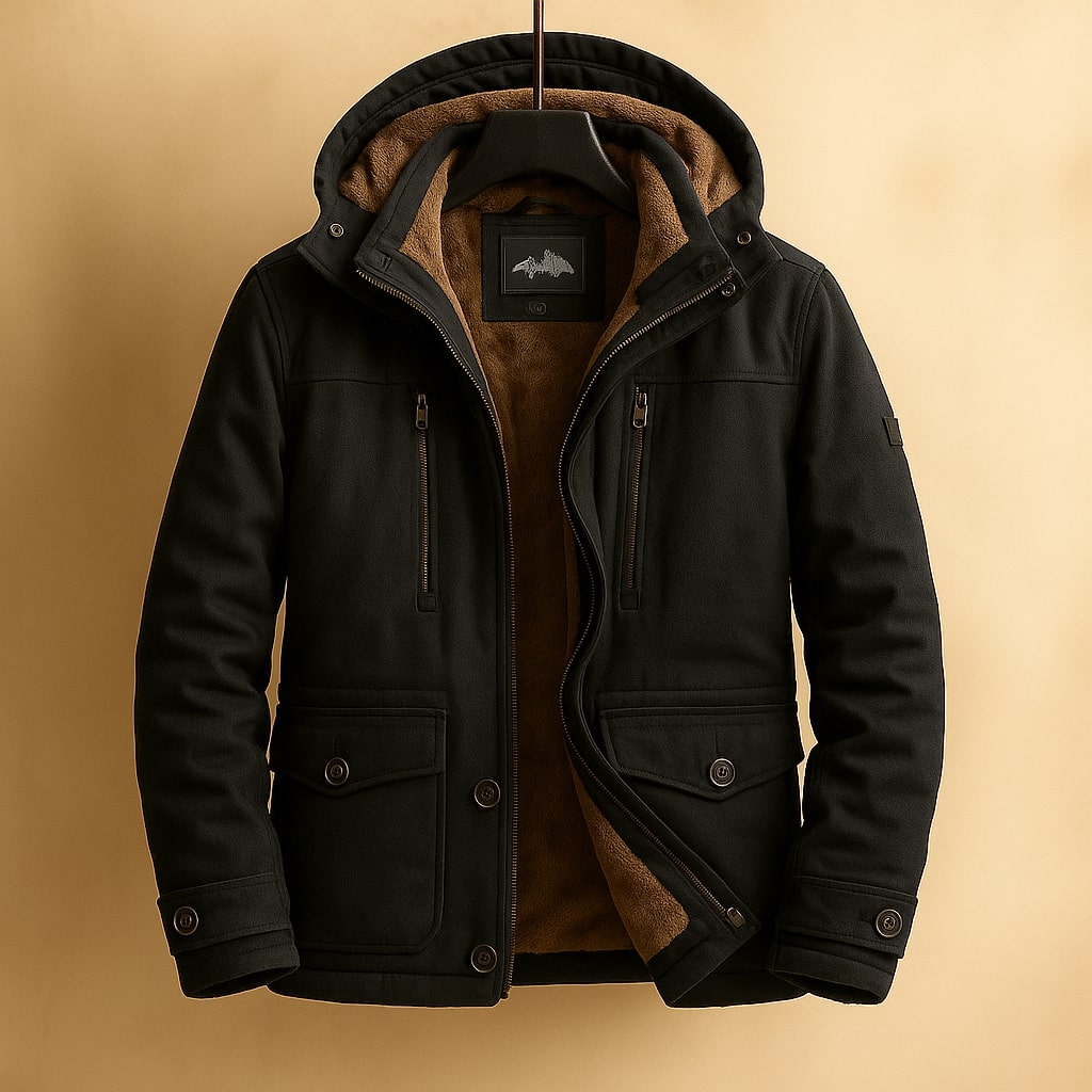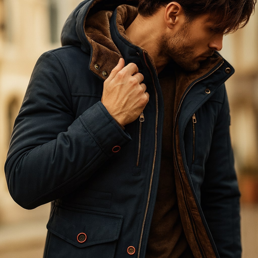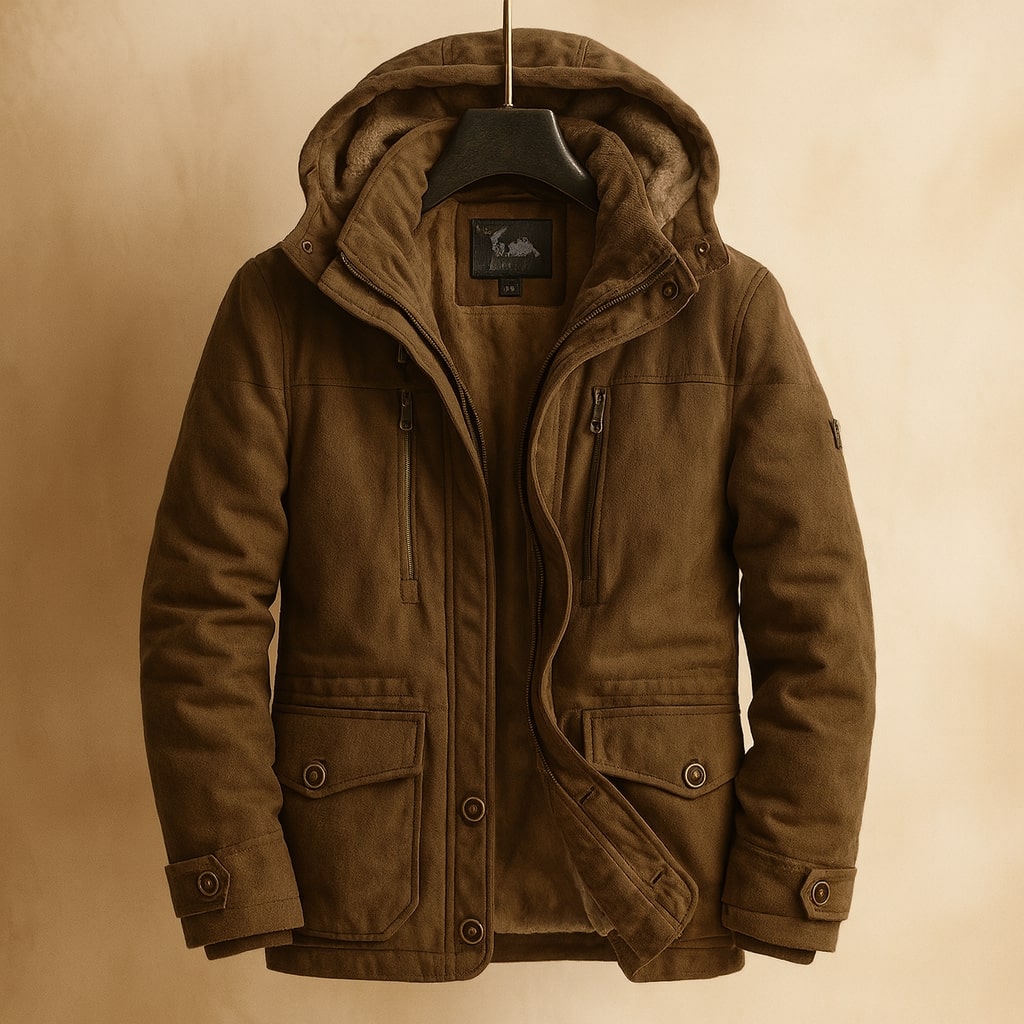 A tightly woven cotton shell paired with a soft interior lining reduces cold and wind penetration while keeping overall weight controlled. The streamlined hood, clean zip-and-snap closure, and balanced pocket placement prevent bulk, maintaining a steady, easy-to-wear silhouette.