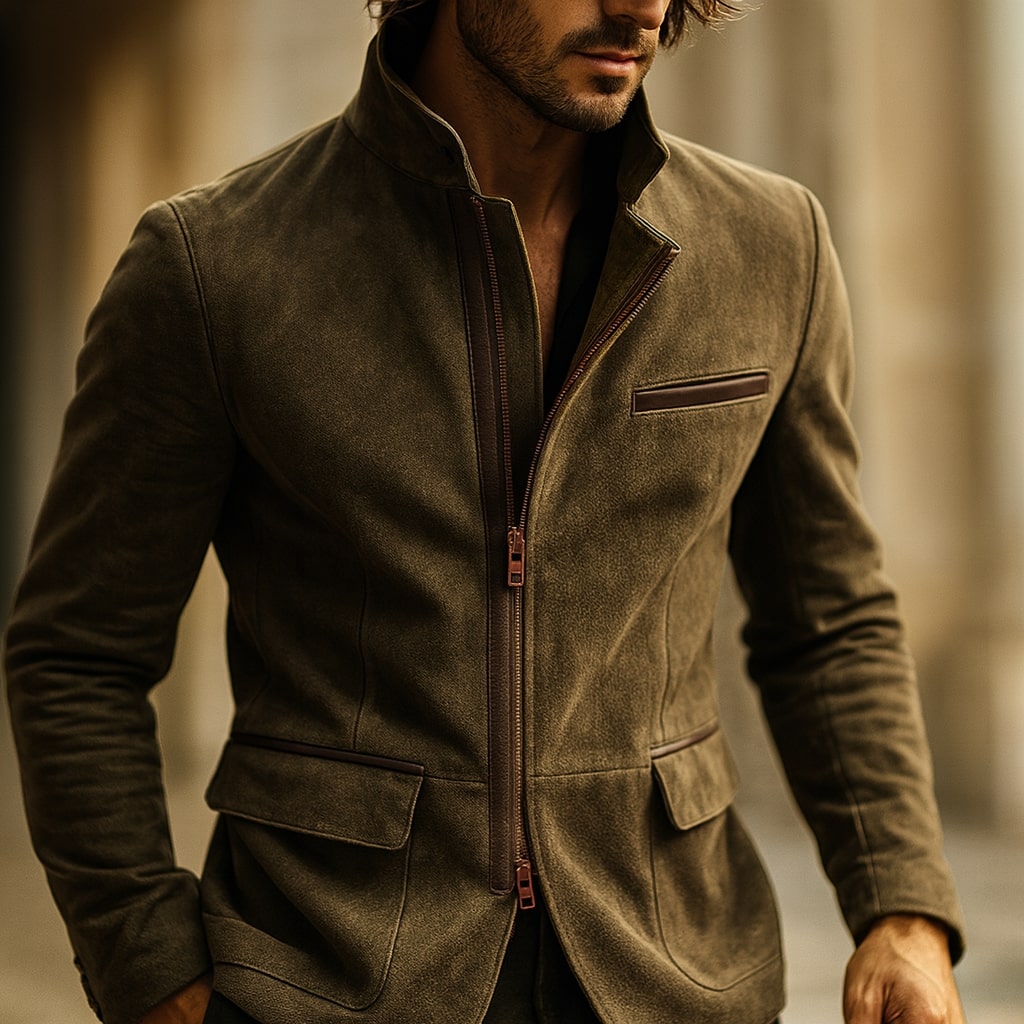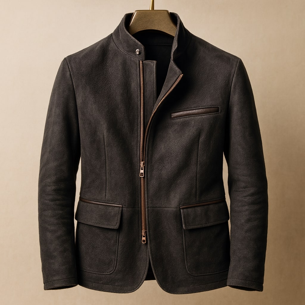 A firm sueded exterior and shaped panel construction prevent sagging and distortion, keeping the jacket’s outline steady and composed. The stand collar and balanced pocket placement reinforce structure, correcting poor fit issues while maintaining a clean, controlled profile.