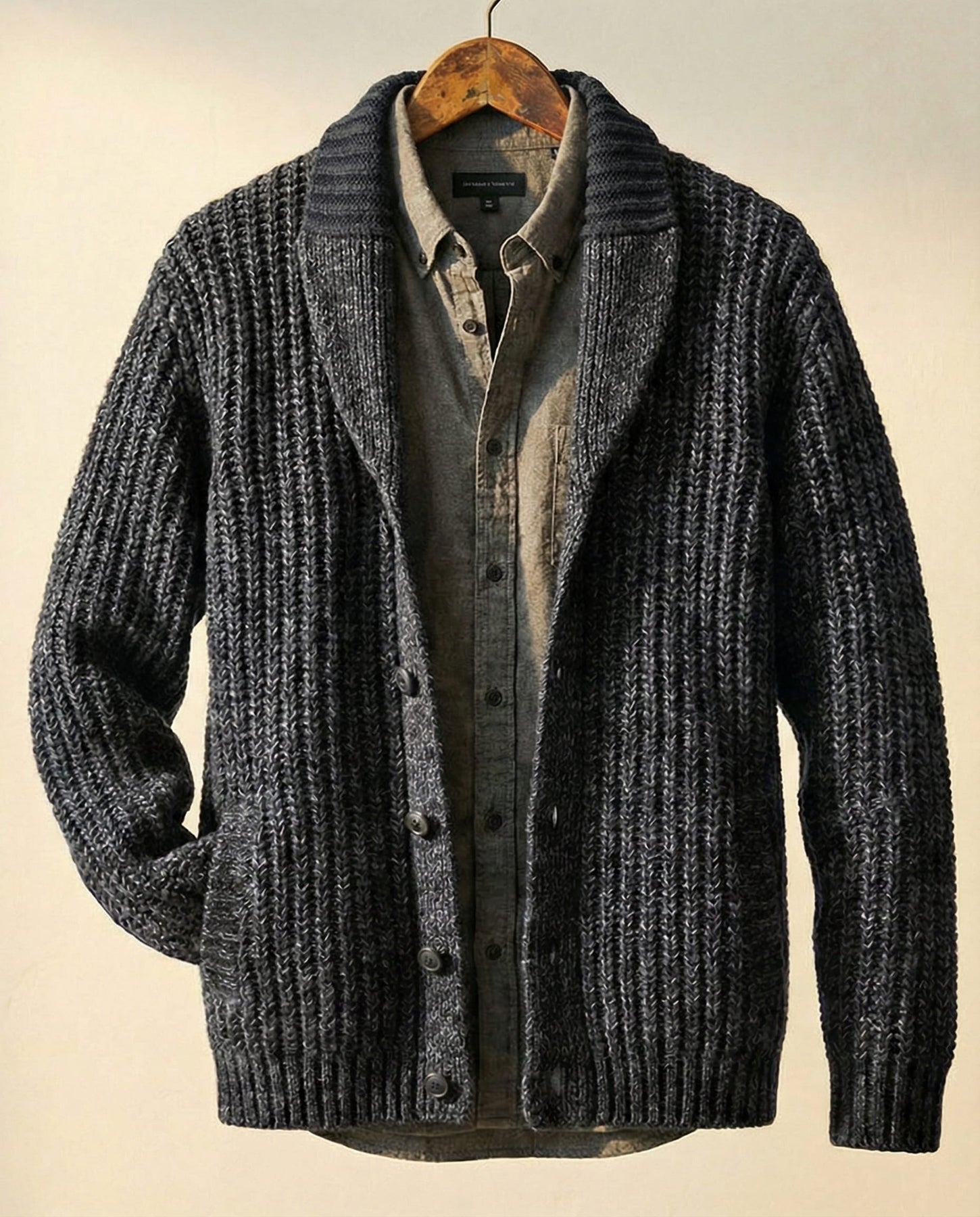 Crafted from a substantial wool-blend knit, this cardigan delivers textured warmth with a reassuring weight that feels both soft and structured against the body. The thick ribbed construction, shawl collar, and deep burgundy tone create a grounded, refined silhouette that layers effortlessly over shirting or tees, offering everyday polish with quiet confidence.
